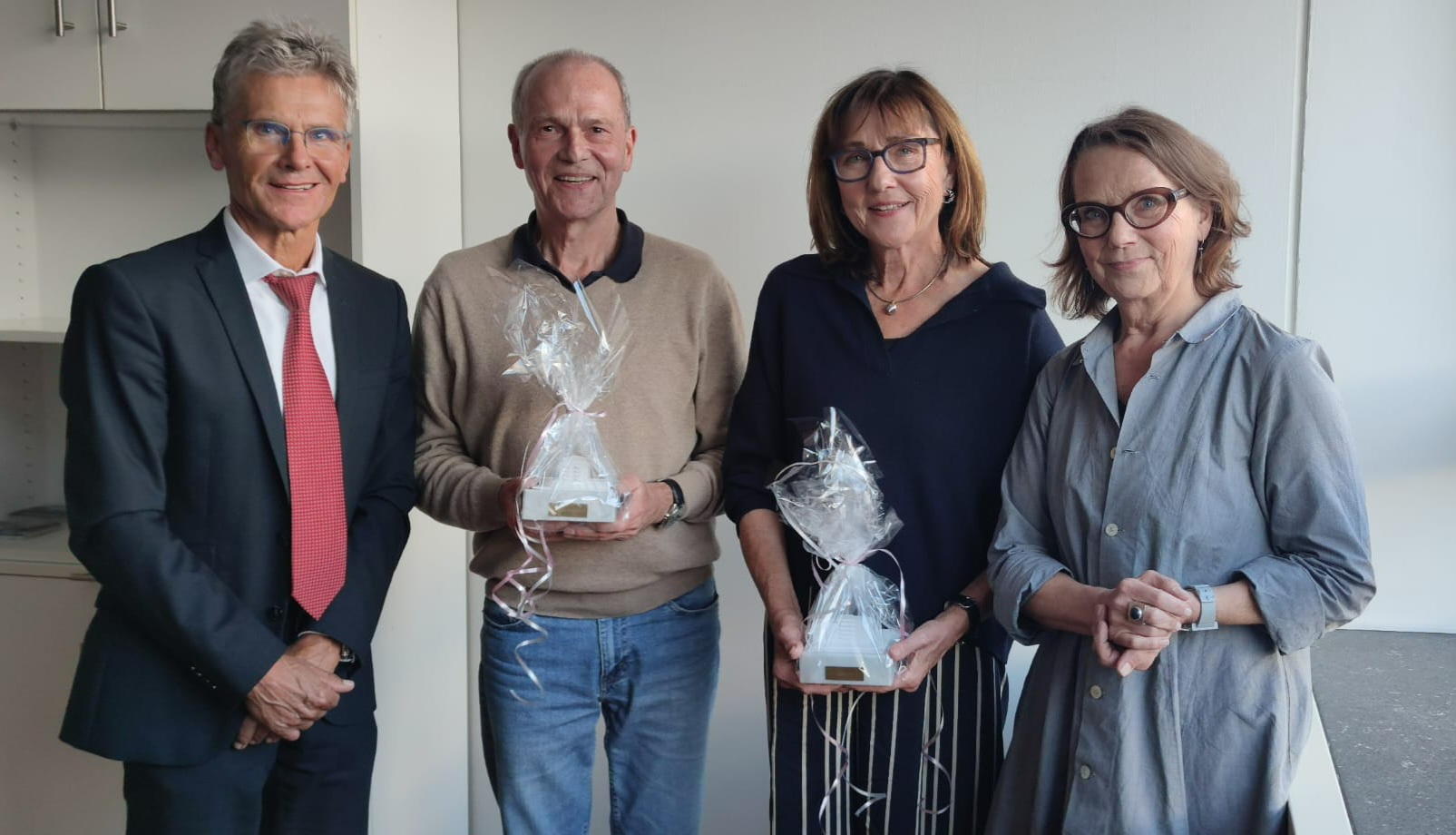In der Generalversammlung der Schlüsselbund eG am 30.09.2025 wurde der neue Vorstand gewählt, bestehend aus Frau Martina Pleyer (rechts) und Herrn Roberto-Joachim Klann (links). Beide lösen den bisherigen Vorstand, bestehend aus Frau Petra Eggert (2. v.r.) und Herrn Rainer Hölzke (2.v.l.), ab.